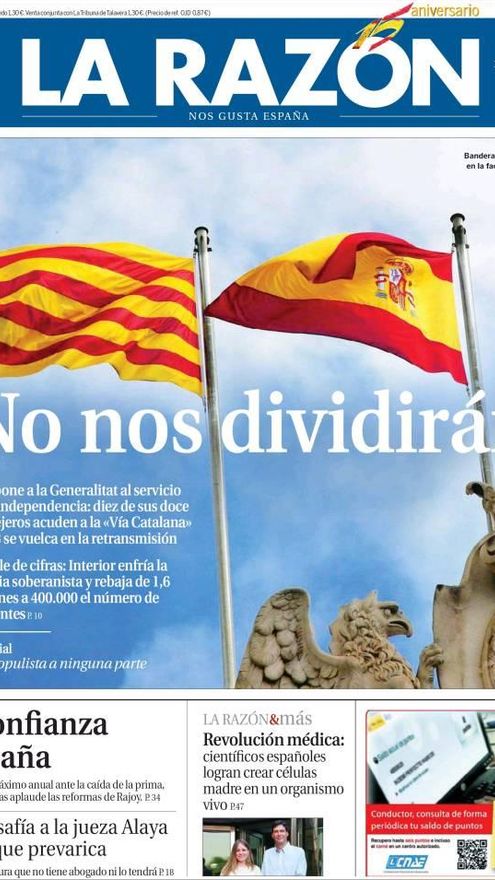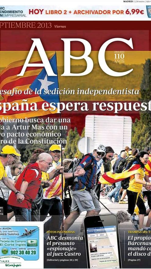 El día siguiente de la Diada, el 12 de septiembre, ABC mandó un mensaje inconfundible: “El desafío del nacionalismo catalán contra España ha desbordado nuestro marco legal. No caben ya más intentos de buscar compromisos imposibles. Es tiempo de encarar de frente y con la ley en la mano un reto que amenaza nuestro modelo de convivencia y la propia continuidad de España como tal. Hoy asistimos a una sedición en toda regla por parte del Gobierno catalán. Ya no camuflan su meta, se trata de destruir España, una de las naciones más antiguas de Europa. (...) Rajoy no puede seguir inhibiéndose ni dialogando en la sombra con los sediciosos que incumplen la ley. (...)”. Y pedía al Gobierno “un cambio de rumbo y que tome las medidas necesarias para defender la unidad de España, tal y como demandan la mayoría de los españoles”.
