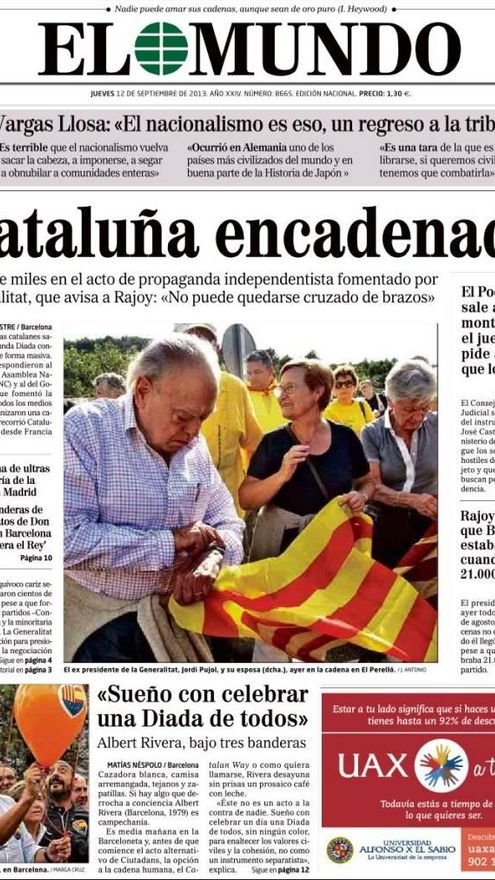 Editorial de El Mundo del día 12 de septiembre: “La bola de nieve que está creciendo en Cataluña sólo se puede explicar por la dejación de responsabilidades del Gobierno de la nación, que ni con Zapatero ni con Rajoy ha hecho nada para que se cumplan las sentencias de los tribunales ni las leyes en materia de lengua, educación y símbolos, conculcadas sistemáticamente por la Generalitat. Rajoy no debe permitir que se vuelva a repetir lo que sucedió ayer en Cataluña, que supone un desafío a la legalidad y una ofensa a todos los españoles”.