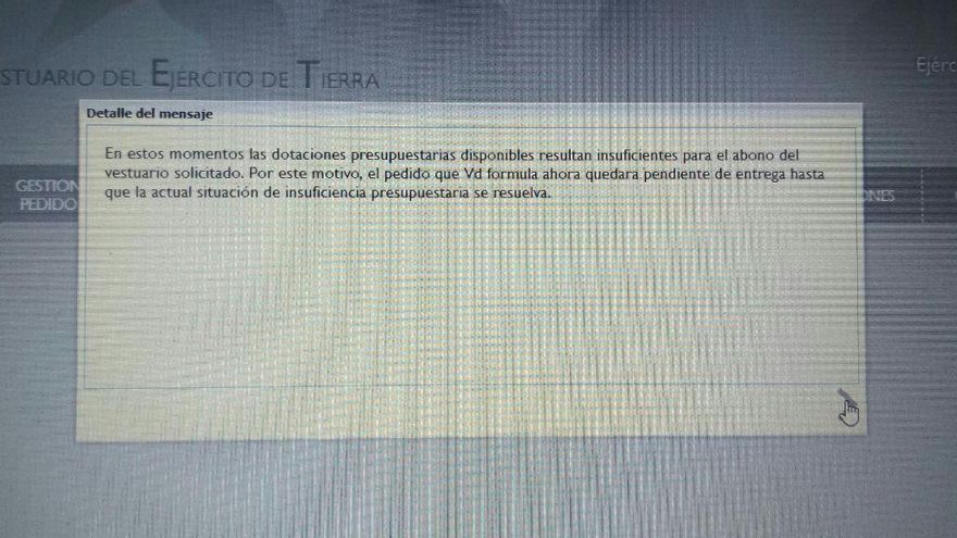 El colectivo Ciudadanos de Uniforme denuncia a través de su canal de Telegram que la plataforma online en la que se realizan estos pedidos, la Aplicación de Vestuario del Ejército de Tierra (AVET), informa de la paralización de estas solicitudes con un mensaje: “En estos momentos las dotaciones presupuestarias disponibles resultan insuficientes para el abono del vestuario solicitado. Por este motivo, el pedido que Vd. formula ahora quedará pendiente de entrega hasta que la actual situación de insuficiencia presupuestaria se resuelva”. Así alertan a los militares de que su demanda se iba a prorrogar sin fecha prevista de entrega.
