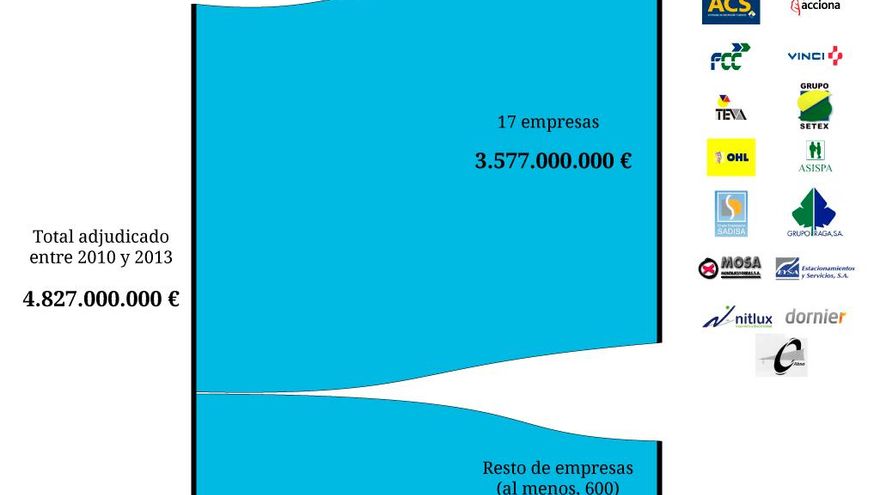 De este total más de 3.500 millones de euros fueron a parar a 17 grandes grupos empresariales, sin contar con las filiales. Es decir, tres de cada cuatro euros de los contratos adjudicados por el Ayuntamiento de Madrid entre 2010 y 2013. Solo los macrocontratos de movilidad y limpieza, adjudicados a finales de 2013, ya suponen más de la mitad de todo el presupuesto municipal en licitaciones para esos años.
