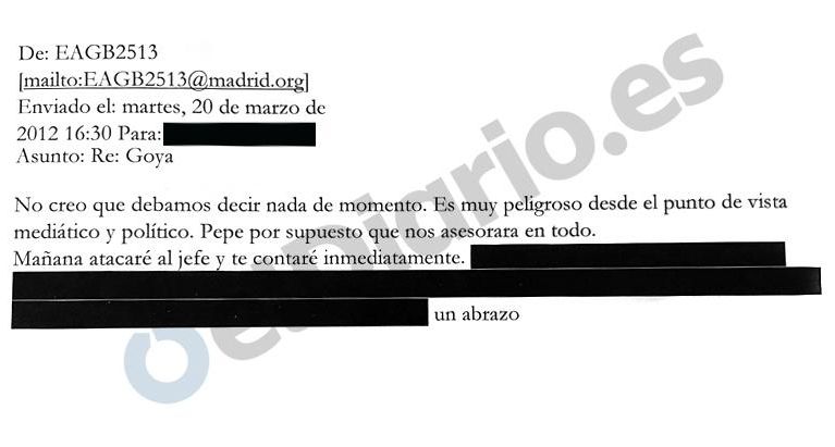 En el correo previo, Íñigo proponía a su cuñada contactar con expertos del Metropolitan Museum Art de Nueva York, donde residía, para que aconsejasen a la familia sobre qué hacer con el Goya. Pero la respuesta de Aguirre es tajante. El silencio es fundamental porque hay un “riesgo mediático y político”. Obviamente, para quien responde el mail: entonces la presidenta de Madrid y una de las políticas más poderosas de España.