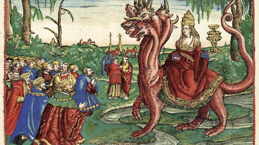 La Bestia del Apocalipsis tenía convocada una rueda de prensa para este martes, la primera en Moncloa desde su reelección. La Ramera de Babilonia a lomos de la bestia de siete cabezas se presentó ante los periodistas para hacer ostentación de su perversión, idolatría y desenfreno.
