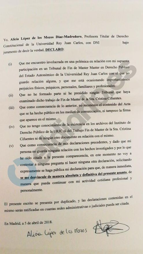La declaración por escrito de una de las supuestas examinadoras de la presidenta de la Comunidad de Madrid, Cristina Cifuentes, Alicia López de los Mozos, suma nuevas dudas sobre la legalidad del máster de la Universidad Rey Juan Carlos, (URJC), Cursado por Cifuentes, así como sobre su Trabajo de Fin de Máster (TFM): “No he formado parte de ningún Tribunal ni tengo constancia del TFM”, afirma López de los Mozos.