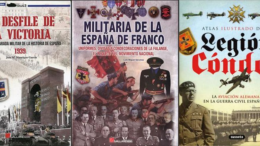También en este sello podemos encontrar Militaria de la España de Franco, de Luis Miguel Sánchez, que repasa los diferentes uniformes, condecoraciones y divisias usadas por Falange, los Requetés y el Movimiento Nacional durante la Guerra Civil y la posterior dictadura, o Atlas ilustrado de la Legión Condor, escrito por Raúl Arias, y que ofrece una perspectiva sobre las fuerzas aéreas enviadas por “el canciller alemán Adolf Hitler” para apoyar a Franco.