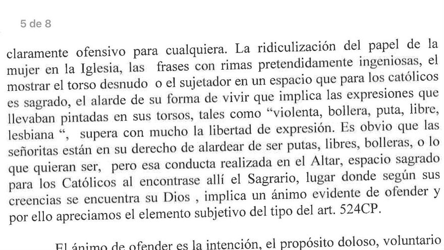 La concejala defendió durante la vista que se trataba también de una protesta contra el machismo imperante en la jerarquía de la Iglesia católica. Para la fiscal, sin embargo, los estudiantes se dedicaron a la “ridiculización del papel de la mujer en la Iglesia”. Esto, unido a “frases con rimas pretendidamente ingeniosas, el mostrar el torso desnudo o el sujetador en un espacio que para los católicos es sagrado, el alarde de su forma de vivir que implica las expresiones que llevaban pintadas en sus torsos (…) supera con mucho la libertad de expresión”, añade Morando en su escrito, al que ha tenido acceso eldiario.es y que fue adelantado por La Razón.