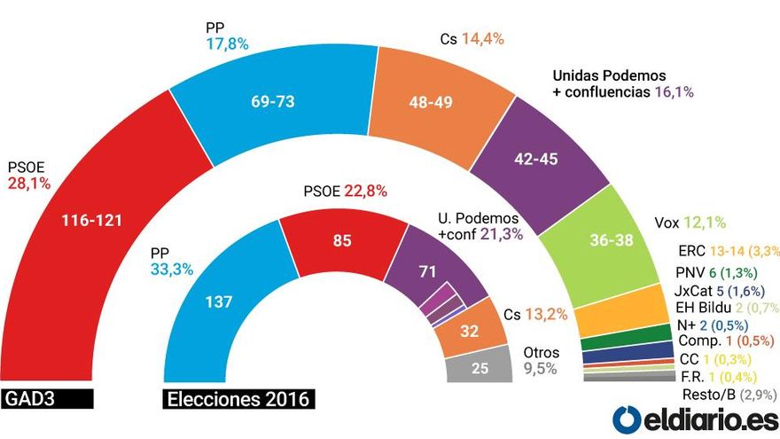 El Sondeo de GAD3 para TVE y las televisiones autonómicas dibuja un panorama en el que Sánchez necesitaría a los independentistas catalanes para formar una mayoría de Gobierno. Los datos de la encuesta sitúan al Partido Socialista como primera fuerza con el 28% de los votos y entre 116 y 121 escaños. La suma de PSOE y Unidas Podemos supera a las tres derechas. Ninguno de los dos bloque suma lo suficiente para garantizar una investidura.