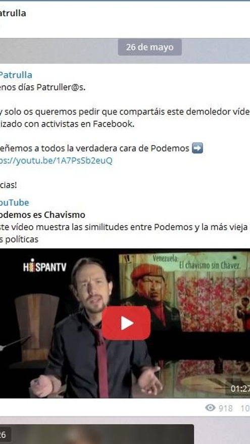 El fulgurante éxito de Podemos tiene una de sus patas en el uso de las redes sociales. No solo por los medios y canales oficiales del partido. Desde la fundación del partido, las herramientas digitales se han convertido en uno de les medios preferentes para diseminar mensajes. Tanto positivos para Podemos como negativos para otros partidos. Uno de los elementos fundamentales es el canal de Télegram Guerrilla, al que están suscrtias más de 3.000 personas y que es capaz de convertir en trending topic cualquier consigna en pocos minutos. A este canal afín a Podemos le ha salido un duro competidor en la precampaña de las elecciones generales del 26 de junio: La Patrulla.