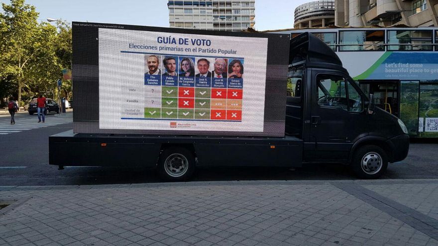 Los vehículos llevan en su exterior las imágenes de los seis aspirantes a presidir el PP y su posición respecto al derecho a la vida, a la familia y a la unidad de España y recorrerán este miércoles, víspera del día de votación para los militantes, las sedes de los populares en Madrid.
