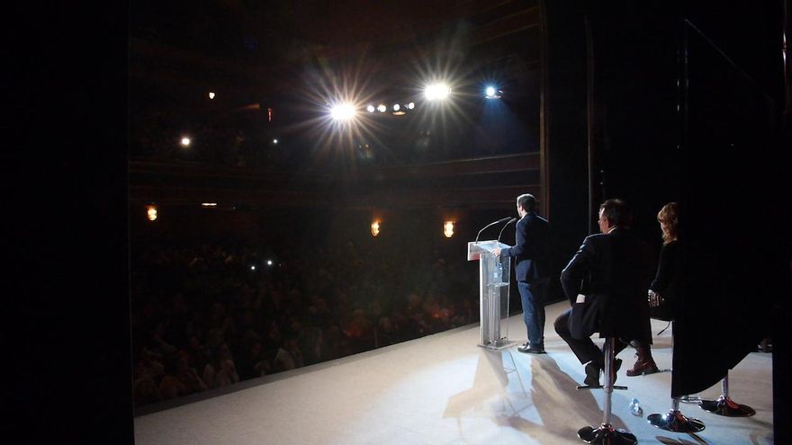 El Teatro de La Latina está a rebosar y fuera cientos de personas hacen cola. “Se ha quedado mucha gente sin poder entrar”, le informa su responsable de prensa, el periodista Daniel Ayllón. “Pues habrá que hacer algo, ¿tenemos algo preparado para la gente que se ha quedado fuera? Hay que preparar algo”, dice Garzón.