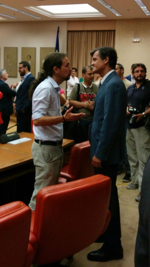 La llegada de los eurodiputados de Podemos a la sala Constitucional del Congreso ha despertado una gran expectación mediática y entre los parlamentarios y visitantes. Nada más sentarse en su sitio, el ex vicesecretario general del PSOE José Blanco, situado en la fila de delante, se ha levantado para saludar al líder de la formación. Tras el acto, los también socialistas Juan Fernando López Aguilar y Ramón Jauregui han departido con Pablo Iglesias durante un largo rato.