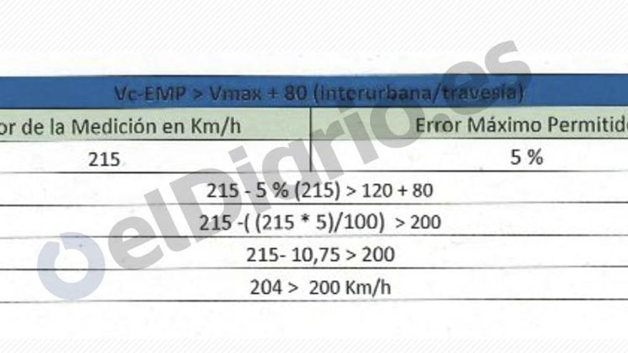 Los 215 kilómetros por hora a los que circulaba Baltar hubieran estado en el límite de la infracción administrativa si se hubiera aplicado un margen de error al radar del 7% del total de la velocidad captada, lo que ocurre cuando el dispositivo que calcula la velocidad también está en movimiento, por ejemplo a bordo de un vehículo de la Guardia Civil. Sin embargo, el tipo de radar utilizado, fijo en un punto, reduce el margen de error que se debe aplicar a un 5%. El cálculo resultante, según muestra la tabla incluida en el atestado que se reproduce a continuación, establece que el líder local del PP viajaba excediendo en 84 kilómetros por hora el máximo permitido.
