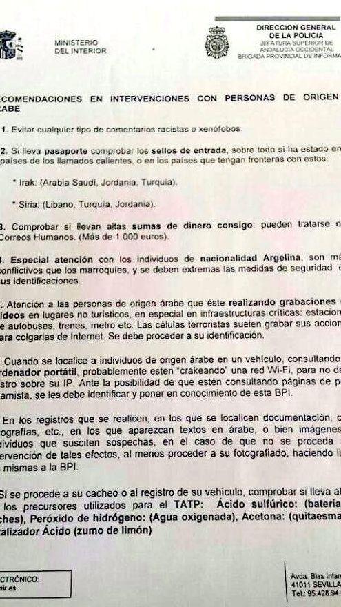 Una nota distribuida entre mandos policiales de la provincia de Sevilla sobre intervenciones con “personas de origen árabe” pide a los agentes extremar las medidas de seguridad en intervenciones con ciudadanos argelinos, por ser “más conflictivos que los marroquíes”, al tiempo que asegura que, si hay un árabe dentro de un coche usando un ordenador portátil, “probablemente esté 'crackeando' una red wifi”.