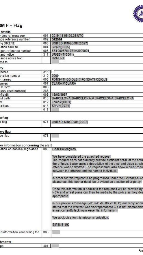 20:35 UTC (21:35 hora española): Es la hora en la que las autoridades británicas fechan el nuevo “mensaje” que minutos después se vuelca en Sirene para que llegue a la Policía española. El nuevo documento paraliza la euroorden emitida por el juez Pablo Llarena por falta de información en su escrito. “La solicitud actualmente no facilita suficientes detalles sobre la naturaleza del delito: hay también una falta de descripción sobre el lugar y hora en el que se cometieron los hechos. La solicitud también debe mostrar una clara conexión entre el delito y el reclamado de manera individual. Para que su solicitud sea cursada como Acto de Extradición 2003, por favor pueden proporcionar más detalles urgentemente. Una vez esta información sea añadida a su solicitud será certificada por la NCA [National Crime Agency] y la decisión sobre la detención por la policía será adoptada si se considera apropiado.