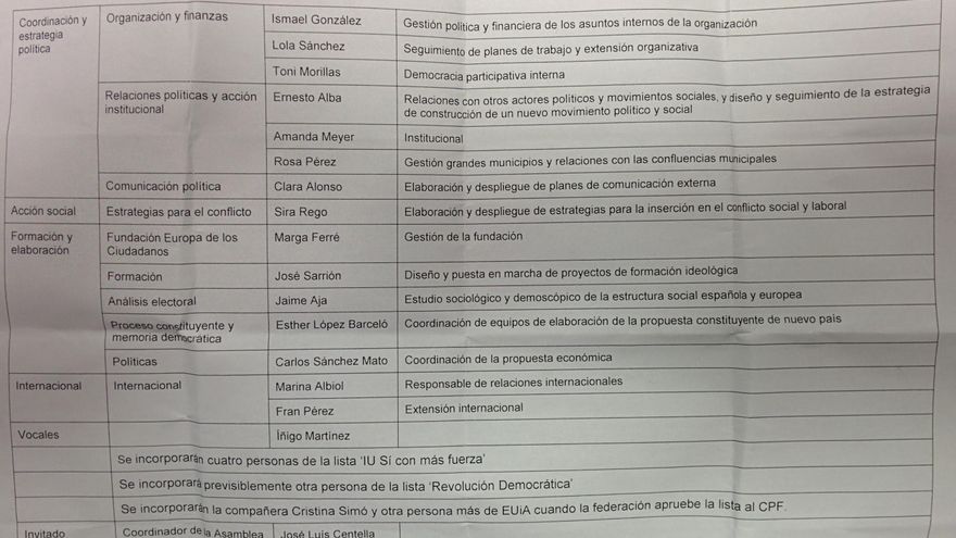 En la primera figuran la Secretaría de Organización y Finanzas, que dirige Ismael González y en la que se incluirán a Lola Sánchez y Toni Morillas. La de Relaciones Políticas y Acción institucioanl, que dependerá de Ernesto Alba, quien compartirá responsabilidades con Amanda Meyer y Rosa Pérez. La comunicación externa recae nuevamente en Clara Alonso.