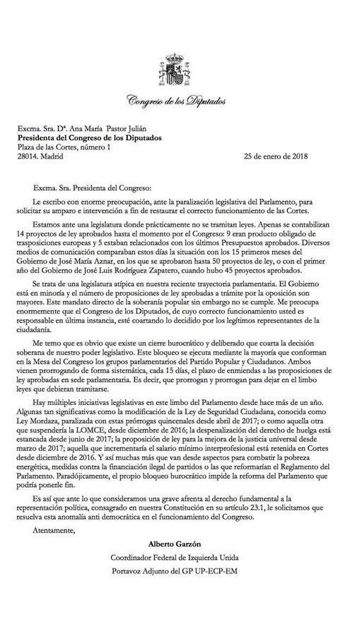 Garzón ha responsabilizado directamente al PP y Ciudadanos de este bloqueo legislativo, por ampliar “de forma sistemática” cada quince días los plazos de enmiendas a las proposiciones de ley aprobadas en sede parlamentaria. “Es decir, que se prorrogan y prorrogan para dejar en el limbo leyes que debieran tramitarse”, añade en su carta.