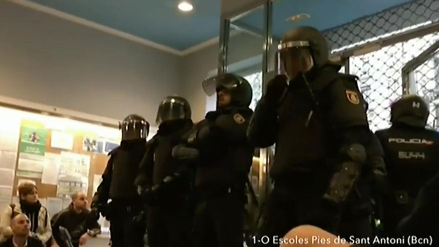 En un vídeo de la agencia EFE proyectado en la sala, se ve a un policía que atiza un porrazo en la cabeza a una persona. Esta se revuelve, protesta y se lleva otro golpe en la cabeza. Pocos segundos después, el que parece que es el mismo agente golpea a una mujer en la cara con la porra sostenida con las dos manos. Repite el movimiento y la mujer cae al suelo. Todo se produce en la calle cuando los agentes ya han entrado en el colegio para llevarse urnas y papeletas, y otros de sus compañeros se quedan fuera formando un cordón. La policía tiene la situación controlada, aunque la tensión persista, pero siempre hay tiempo para un golpe más.