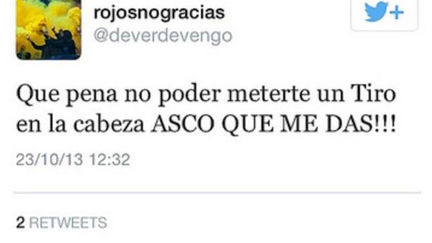 El PP condenó la expresión del ultra, cuyo nombre en Twitter era entonces 'rojosnogracias': “¡Menuda salvajada! ¡Fuera gente como tu! ¡Pide disculpas!”. “Calla cerdo vosotros hundís a España. Muerte a los traidores”, fue la respuesta del ultra, según relata la denuncia presentada por el PSOE.