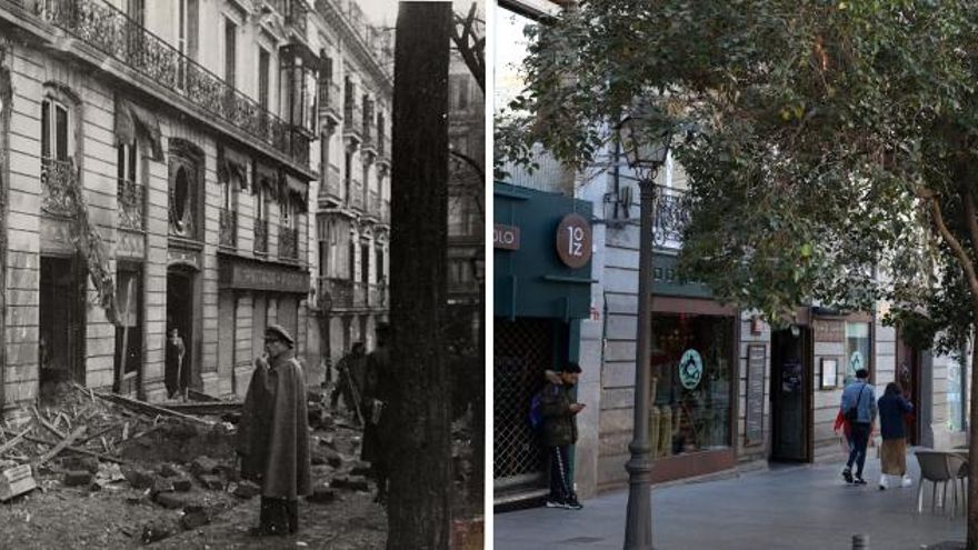 “La calle Alameda fue una de las más perjudicadas”, continúan. “La excusa militar era que estaban atacando a los pilotos soviéticos, que se alojaban en el Hotel Savoy. Esta calle fue de las más dramáticas, uno de los sitios donde no querrías estar”. El hotel - que hace esquina entre la calle Moratín y el Paseo del Prado y actualmente alberga un restaurante en la planta baja - quedó tocado, aunque la puerta y su cubierta se mantienen.
