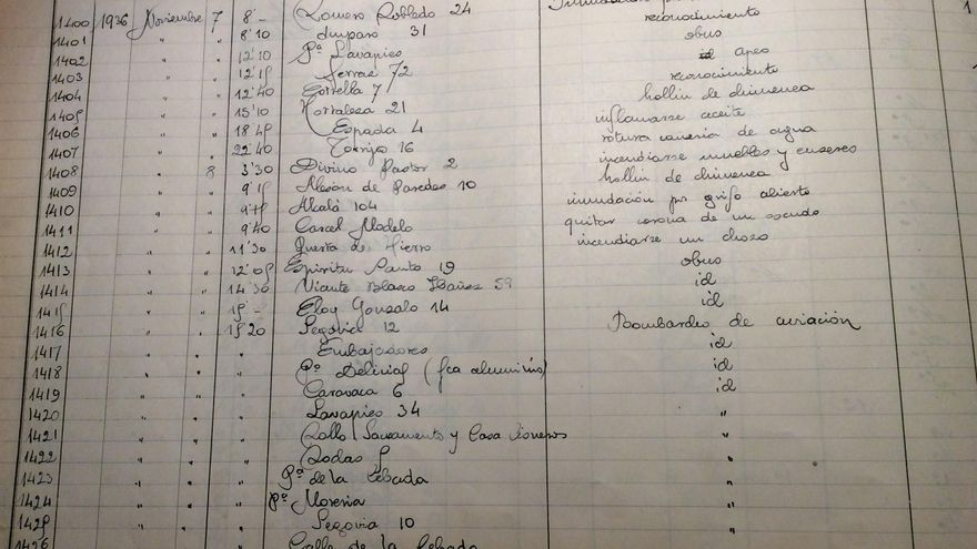 En la hoja de comienzos de noviembre se ve muy claro. Las causas por las que salían los bomberos hasta el día 7 eran normales: “inundación por rotura de cañería, hollín de chimenea, incendio..”. Pero a partir del día 8 a las doce del mediodía empieza el bombardeo. “Obús. Ídem. Ídem. Bombardeo de aviación. Ídem. Ídem. Ídem. Ídem. Ídem. Ídem. Ídem. Ídem. Ídem. Ídem. Ídem”.