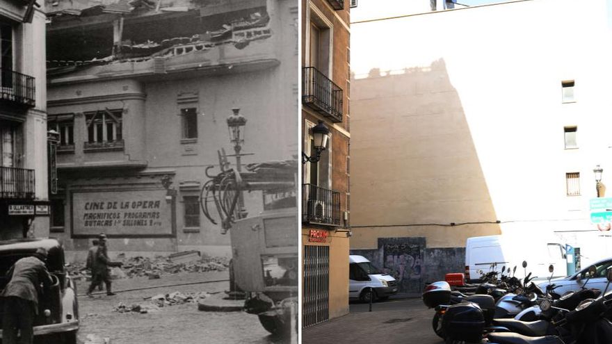 Vayamos, por ejemplo, a la Plaza de Isabel II, en la parada de metro de Ópera. Allí estuvo hasta 1936 el Cine de la Ópera, un edificio modernista de los años 20. Las fotografías de las bombas dejan ver su esquina curvada, que poco tiene que ver con la entrada actual al Real Cinema, que lo sustituyó.