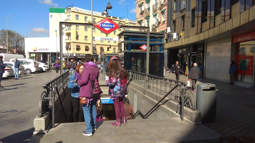 Camino de Usera, al otro lado del río, hay que pasar por la Plaza de Legazpi. Nudo de comunicaciones entre el sur y el centro de la ciudad. En la boca del Metro, dos mujeres reparten propaganda sobre el 8M.