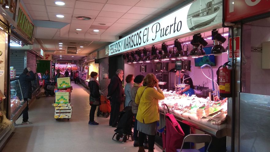 Dentro del mercado, la imagen es similar. Los puestos abiertos y preparando la mercancía en los expositores. Tras los mostradores, mayoría de hombres. A este lado, ganan las mujeres. La edad media entre las clientas, alta. La huelga feminista es laboral, pero también de consumo, de cuidados y de educación, donde la presencia de las mujeres es abrumadoramente mayoritaria.