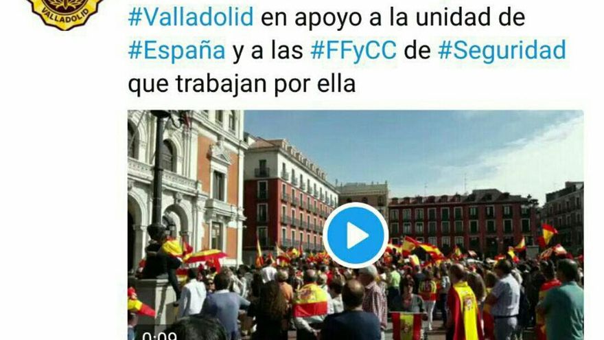 Mientras los Indignados recibían todo tipo de insultos, un tuit de la Policía Local de Valladolid sorprendió a los ediles. “Manifestación en #PlazaMayor de #Valladolid en apoyo a la unidad de #España y a las #FFyCC de #Seguridad que trabajan con ella”. El mensaje, acompañado de un vídeo, llegó mientras precisamente los policías locales y nacionales intentaban contener a los ultras que habían cercado a los pro refugiados. Los concejales de VTLP avisaron inmediatamente al edil responsable de Seguridad y el tuit se borró. Pero exigirán también explicaciones.