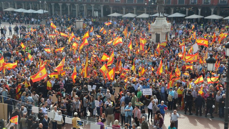 El Colectivo Indignado comunicó hace un mes a la Subdelegación la concentración que iba a tener lugar el sábado en la Plaza Mayor a las 12.00 horas. Mientras los integrantes de este colectivo estaban desplegando una mesa con folletos informativos y una pancarta, la plaza empezó a llenarse de manifestantes contra el referéndum y por la unidad de España que llevaban banderas, tanto la franquista como la constitucional, y alguna de unidades militares.