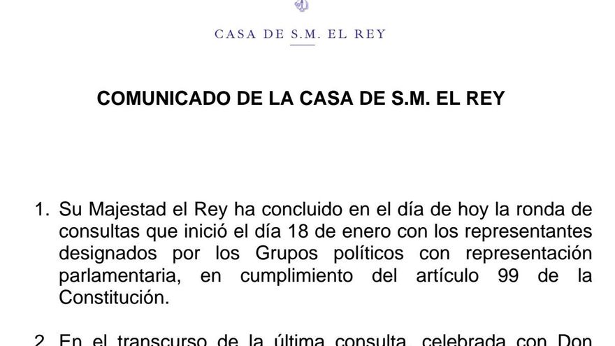 El rey ha pedido al presidente del Congreso que el lunes se reúnan de nuevo para que le haga llegar un listado de los portavoces de los partidos con representación a los que volverá a recibir. La nueva ronda de contactos comenzará el miércoles 27. Tras recibir de nuevo a todos los portavoces, el rey designará a un nuevo candidato para que se someta a la investidura.