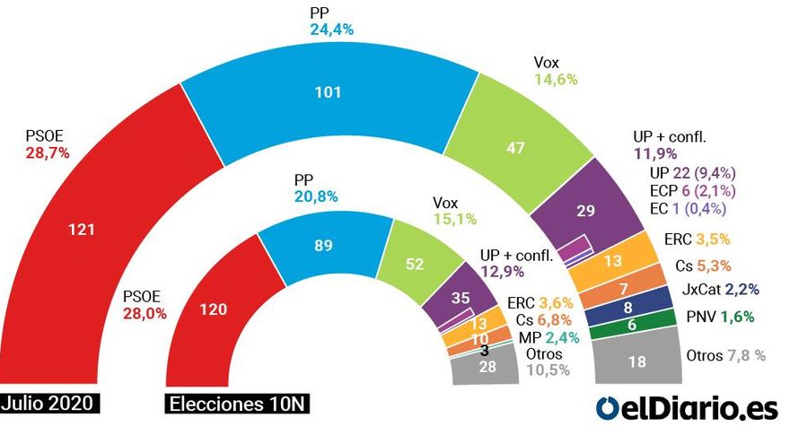 El PSOE y el PP están capitalizando la gestión de la crisis sanitaria, económica y social producida por la pandemia del coronavirus. El barómetro de Celeste-Tel realizado a finales de julio para elDiario.es sitúa a los de Pedro Sánchez por encima del resultado de las elecciones del 10 de noviembre, con un 28,7% del voto y 121 diputados. Los socialistas habrían sumado 1,7 puntos y ocho escaños en casi dos meses, si se compara con la encuesta realizada a principios de junio. El PP, por su parte, también suma apoyos. Pablo Casado mantiene la tendencia al alza que comenzó en abril y alcanzaría el 24,4% de los votos y 101 diputados, según la encuesta. Los otros grandes partidos estatales, Vox, Unidas Podemos y Ciudadanos, sería la cruz del estudio y perderían voto y representación. El resto de formaciones con presencia parlamentaria se mantienen estables.
