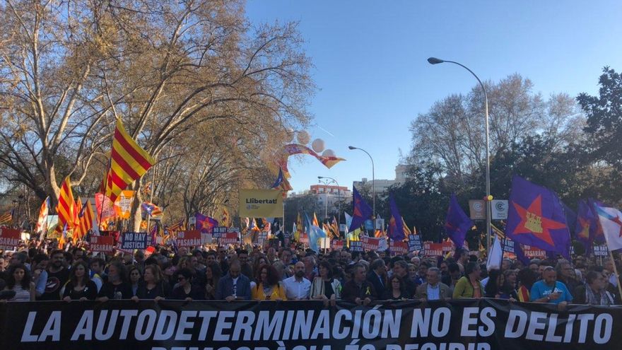 Una marea de senyeras ha inundado el madrileño Paseo del Prado este sábado para clamar contra el juicio del procés y exigir la libertad de los dirigentes independentistas que se encuentran en prisión provisional. 'La autodeterminación no es delito. Democracia es decidir' es el lema de la manifestación que ha discurrido entre Atocha y Cibeles convocada por entidades sociales, como Òmnium Cultural y ANC, y en la que han participado los partidos soberanistas, como ERC, Junts per Catalunya y la CUP. Decenas de políticos independentistas, entre ellos, el presidente catalán, Quim Torra, y varios miembros del Govern, así como el presidente del Parlament, Roger Torrent, y diputados se han desplazado a Madrid.
