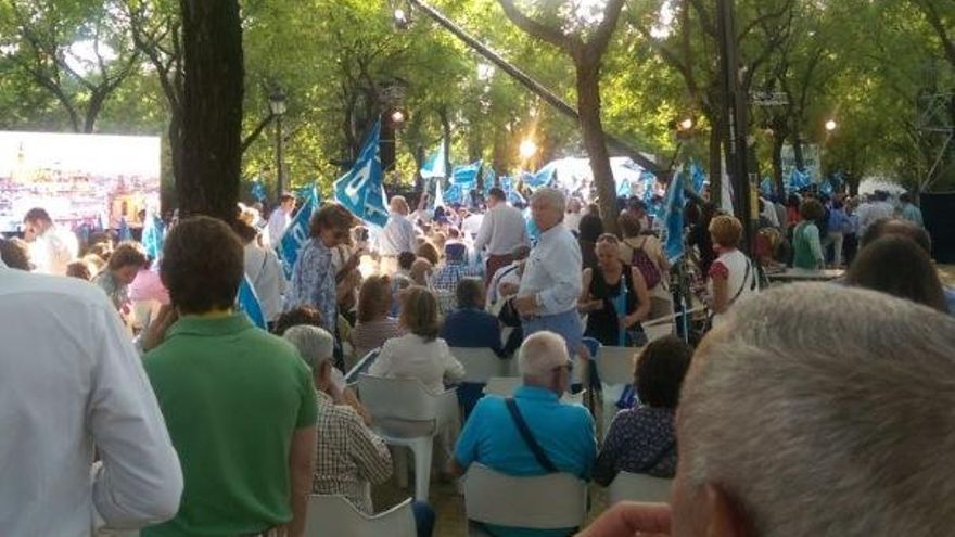 Podríamos decir que la media de edad de los presentes rondaba los 75 años y el margen de error sería de año arriba, año abajo (radicalmente opuesto al acto de Ciudadanos, por cierto, donde la mayoría era gente joven). Una cosa que me sorprendió muchísimo es el cambio que han dado los mítines del Partido Popular: muy poca gente vestida con ropa de marca, pulseras con la bandera de España o gomina en el pelo; luego caí en que los votantes de este perfil estaban todos ayer viendo a Rivera. Cuadraba.