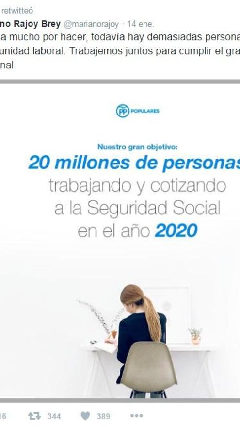 Entre los mensajes de los que se hacen eco se encuentra una publicación de Mariano Rajoy del 14 de enero en la que aparece un cartel con una promesa del PP de cara al final de su mandato: que 20 millones de personas estén trabajando y cotizando a la Seguridad Social. Recoge también un texto del presidente de Gobierno: “Queda mucho por hacer, todavía hay demasiadas personas sin una oportunidad laboral. Trabajemos juntos para cumplir el gran objetivo nacional”. En la imagen aparece el logo del partido.