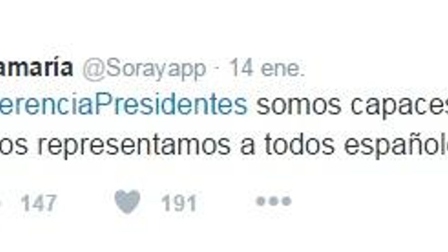 En los mensajes retuiteados, Sáenz de Santamaría afirma que se avanzará si todos los presentes en la Conferencia autonómica son “capaces” de darse cuenta de que “allí reunidos representamos a todos españoles” y Mariano Rajoy defiende su “mano tendida al diálogo y los acuerdos por el interés general”.