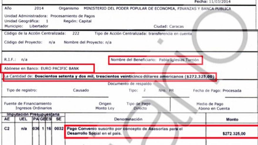 La información de OkDiario asegura que la Policía española, sin especificar qué cuerpo ni bajo qué jurisdicción, ha recibido unos documentos procedentes de “archivos secretos y encriptados del Gobierno venezolano” entre los que destaca una supuesta orden de pago en favor de “Pablo Iglesias Turrión” en una cuenta del Euro Pacific Bank, una entidad “con sede en las islas caribeñas de San Vicente y las Granadinas”, según la información.