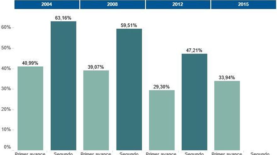 La simultaneidad de comicios autonómicos y generales siempre ha ofrecido mejores índices de participación. La tendencia de participación a la baja en unas elecciones en solitario no se rompe, a pesar de que se trata de una cita electoral en la que confluyen nuevas fuerzas políticas como Podemos o Ciudadanos y en la que la actual presidenta de la Junta, Susana Díaz, que parte como favorita en los sondeos, se pone a disposición de los ciudadanos por primera vez para revalidar su mandato.