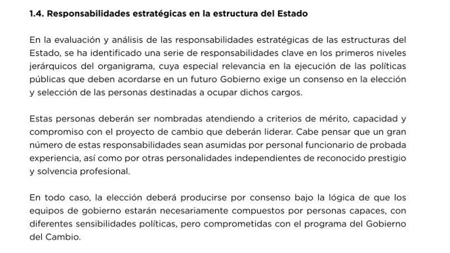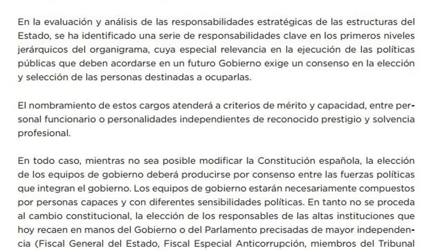 “Se ha identificado una serie de responsabilidades clave en los primeros niveles jerárquicos del organigrama cuya especial relevancia en la ejecución de las políticas públicas que deben acordarse en un futuro Gobierno exige un consenso en la elección”, arranca el punto en cuestión.