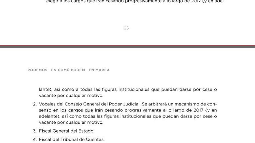 El siguiente párrafo amplía su redacción para explicar mejor las intenciones de Podemos: “Mientras no sea posible modificar la Constitución española, la elección de los equipos de gobierno deberá producirse por consenso entre las fuerzas políticas que integran el gobierno”. Elimina la referencia al compromiso con “el programa del Gobierno del Cambio” y apunta: “En tanto no se proceda al cambio constitucional, la elección de los responsables de las altas instituciones que hoy recaen en manos del Gobierno o del Parlamento precisadas de mayor independencia (fiscal General del Estado, fiscal Especial Anticorrupción, miembros del Tribunal Constitucional, etcétera) se llevará a cabo con criterios reforzados de consenso”.
