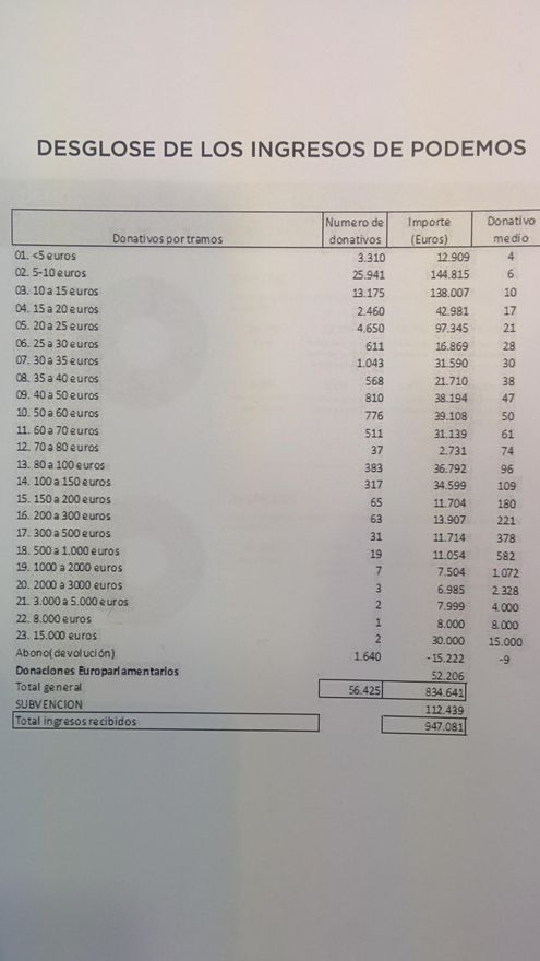 González ha desglosado las donaciones recibidas por Podemos desde su fundación. De media, el partido de Pablo Iglesias ha ingresado por este concepto 14,74 euros. “La mayoría son de entre cinco y 10 euros: nueve de cada diez donaciones son menores de 25 euros”.