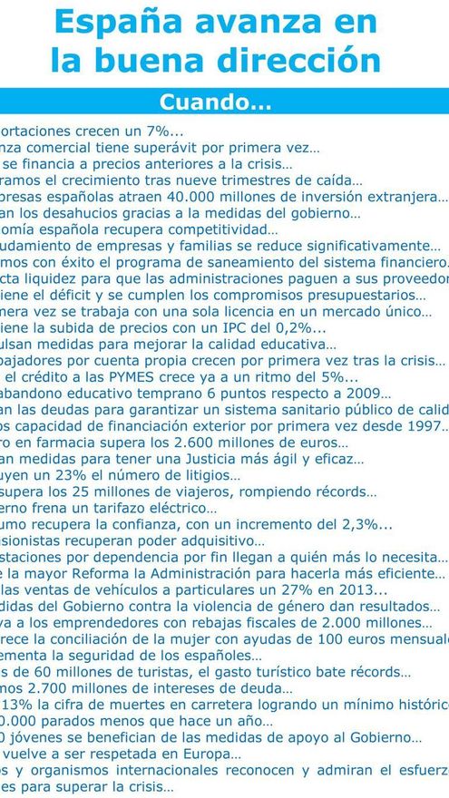 Finalmente, pone en valor que haya casi 150.000 parados menos que hace un año, que 110.000 jóvenes se beneficien de las medidas de apoyo al Gobierno, que el gasto turístico “bata récords”, que se ahorre 2.700 millones de intereses de deuda o que “España vuelva a ser respetada en Europa”.
