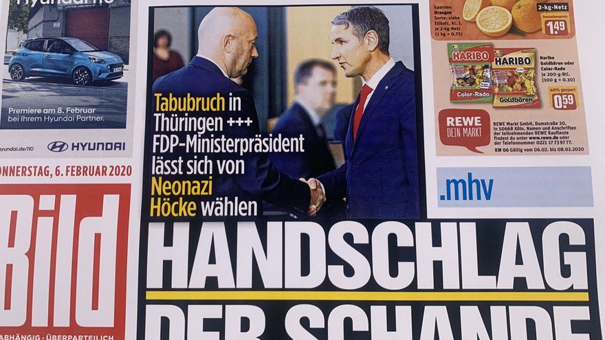 En Turingia, el líder regional de los liberales fue elegido por sorpresa con los votos de la CDU y AfD culminándose con éxito los planes trazados por el líder local de AfD, Björn Höcke, mientras los conservadores pensaban que sus dirigentes del Estado aceptarían como mal menor la permanencia de Die Linke (La Izquierda) en el poder. “Fue un mal día para la democracia”, dijo Merkel. “El apretón de manos de la vergüenza”, tituló en portada el tabloide conservador Bild con la foto del saludo de Höcke al líder liberal en Tutingia que un día después prometió renunciar al puesto para que se repitan las elecciones.