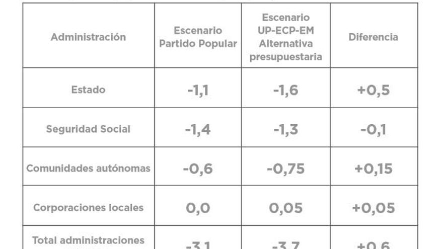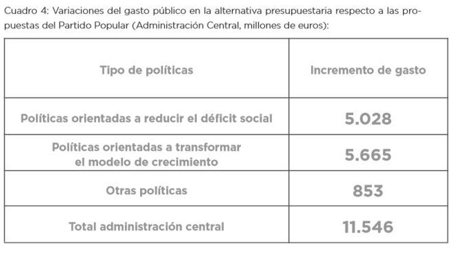 “Nuestra alternativa se basa en la necesidad de incrementar el gasto público para poder reducir el déficit social”, asegura el texto, que apuesta por una reforma fiscal para incrementar los ingresos y cumplir así con el objetivo de déficit, que pasa a ser un “objetivo secundario”.