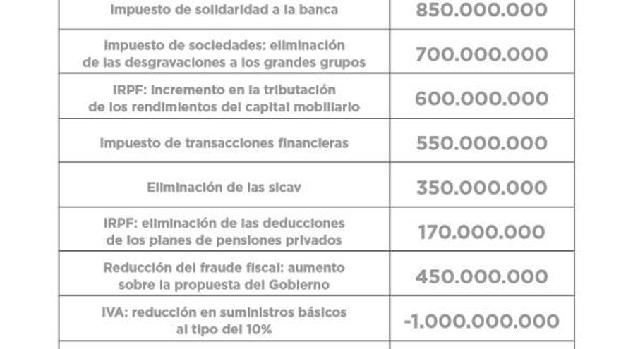 En la parte de ingresos, Unidos Podemos aboga por eliminar “los beneficios fiscales de carácter más regresivo”, como “los planes privados de pensiones en el IRPF”; incrementar del gravamen sobre las rentas del capital en el IRPF; “más progresividad en el IVA”, con una bajada “al 4% de los bienes culturales y los de primera necesidad” y “al 10% los suministros básicos”; y “se crea un impuesto de solidaridad sobre los beneficios de la banca”.