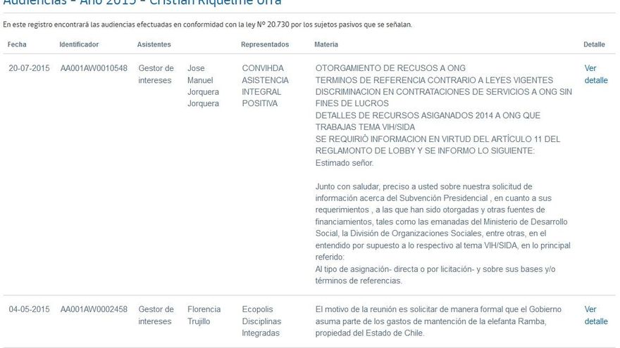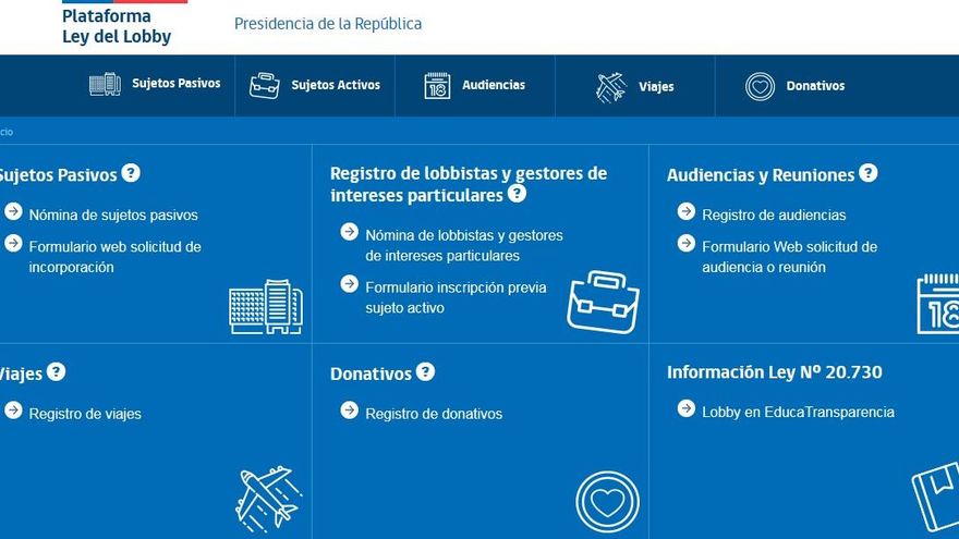 La presidenta de Chile, Michelle Bachelet, debe informar de los donativos que recibe, las reuniones que mantiene y también los viajes que realiza por cuenta del Estado. Esta plataforma también permite presentar solicitudes de audiencias con alguno de los miembros del Ejecutivo.