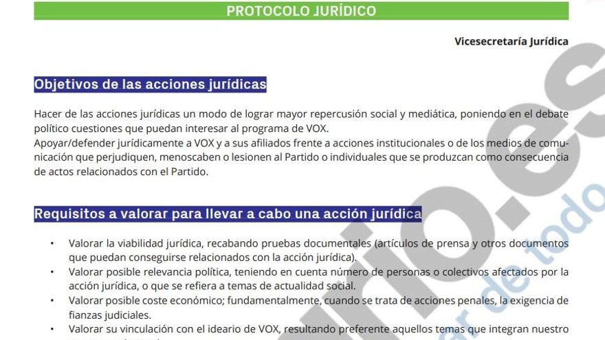 El manual al que ha accedido esta redacción deja claro que la perspectiva jurídica es uno de los ejes sobre los que se vertebra esta formación en su delegación más relevante, la de Madrid, presidida por Rocío Monasterio. Junto a este protocolo, el resto de estrategias que se desarrollan están mucho más centradas en el funcionamiento interno del partido como la afiliación, la financiación, la comunicación, las redes sociales y la movilización.