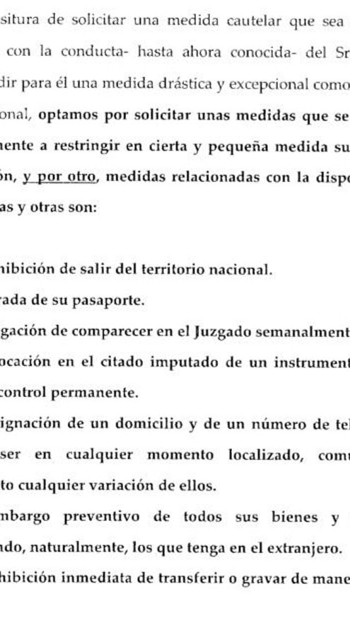En concreto, esta parte pidió la “colocación en el citado imputado de un instrumento electrónico para su control permanente”, la prohibición de que salga del territorio nacional, la retirada del pasaporte y la obligación de que comparezca todas las semanas en el juzgado más próximo a su domicilio.