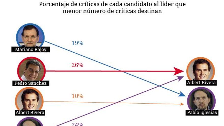 El poco interés de Rivera en criticar a Iglesias es recíproco, aunque el candidato de Podemos, cuarto en las encuestas, ataca más al de Ciudadanos. Iglesias le dedica el 24,2% de sus ataques en los mensajes de campaña.