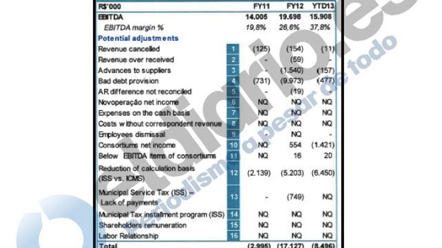 Es más, Rodríguez no solo contaba con los datos de Emissao, muy por debajo de los que él presentó al Canal, sino que conocía la existencia de una due dilligence elaborada por la auditora KPMG, que rebajaba aún más los resultados de la empresa: 2,5 millones en 2012, que subían a 7,4 para el ejercicio siguiente. El primer año, la discrepancia de las cifras que presentó Rodríguez con las que constaban en el informe de la auditoría que tenía en sus manos supera los 10 millones de dólares.