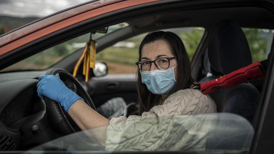 Los coches van parando de tres en tres en esta rotonda en el kilómetro 38 de la A2. “Estoy muy emocionada”, María del Carmen justifica sus respiraciones largas para tomar aire, pero vuelve a perderlo en la siguiente frase, “mi marido falleció hace unos días por el virus”. Viene a recoger a su hija al mismo laboratorio en el que hace apenas dos semanas trabajaba también su cónyuge. “Me da pánico, terror, que mi hija espere en la calle y coja el transporte público”, continúa mostrando el desinfectante que lleva siempre consigo.