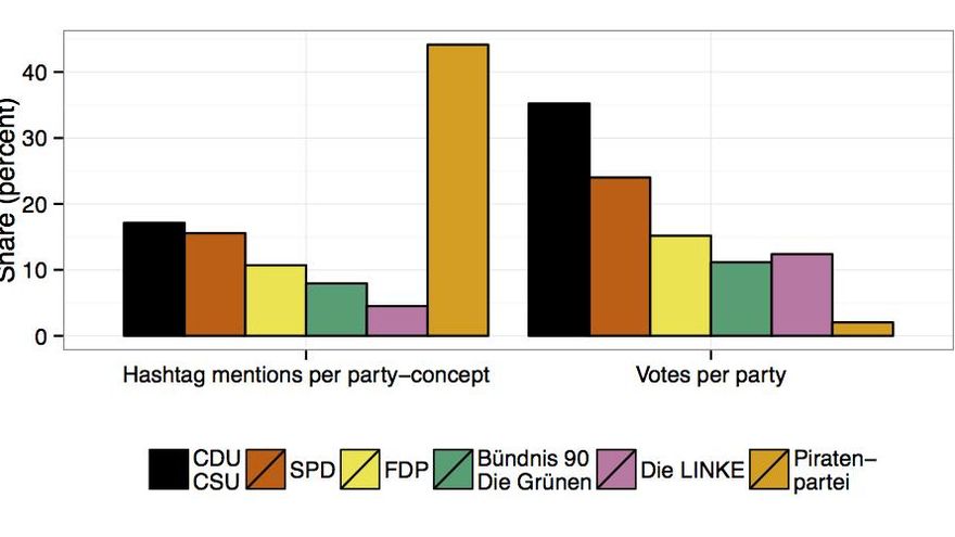 Acaba de publicarse otro paper que analiza esta supuesta correlación, esta vez centrado en las elecciones legislativas alemanas de 2009. Los resultados no pueden ser más negativos para quienes pretenden que Twitter sea el oráculo perfecto. Durante la campaña, el partido más mencionado en esta red —con diferencia— fue el Partido Pirata, que sin embargo apenas alcanzó el 2% de los sufragios y ni siquiera consiguió representación en el Bundestag: mucha presencia en la red, debilidad en las urnas. Además, los socialistas casi hubieran empatado con la CDU y Die Linke hubiera sido la cuarta fuerza del país (ver gráfico).